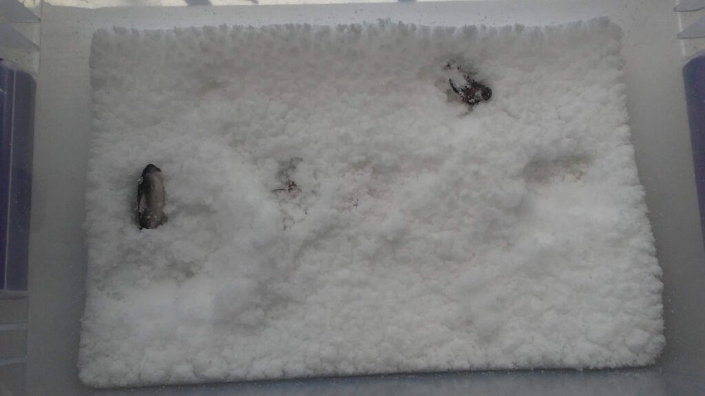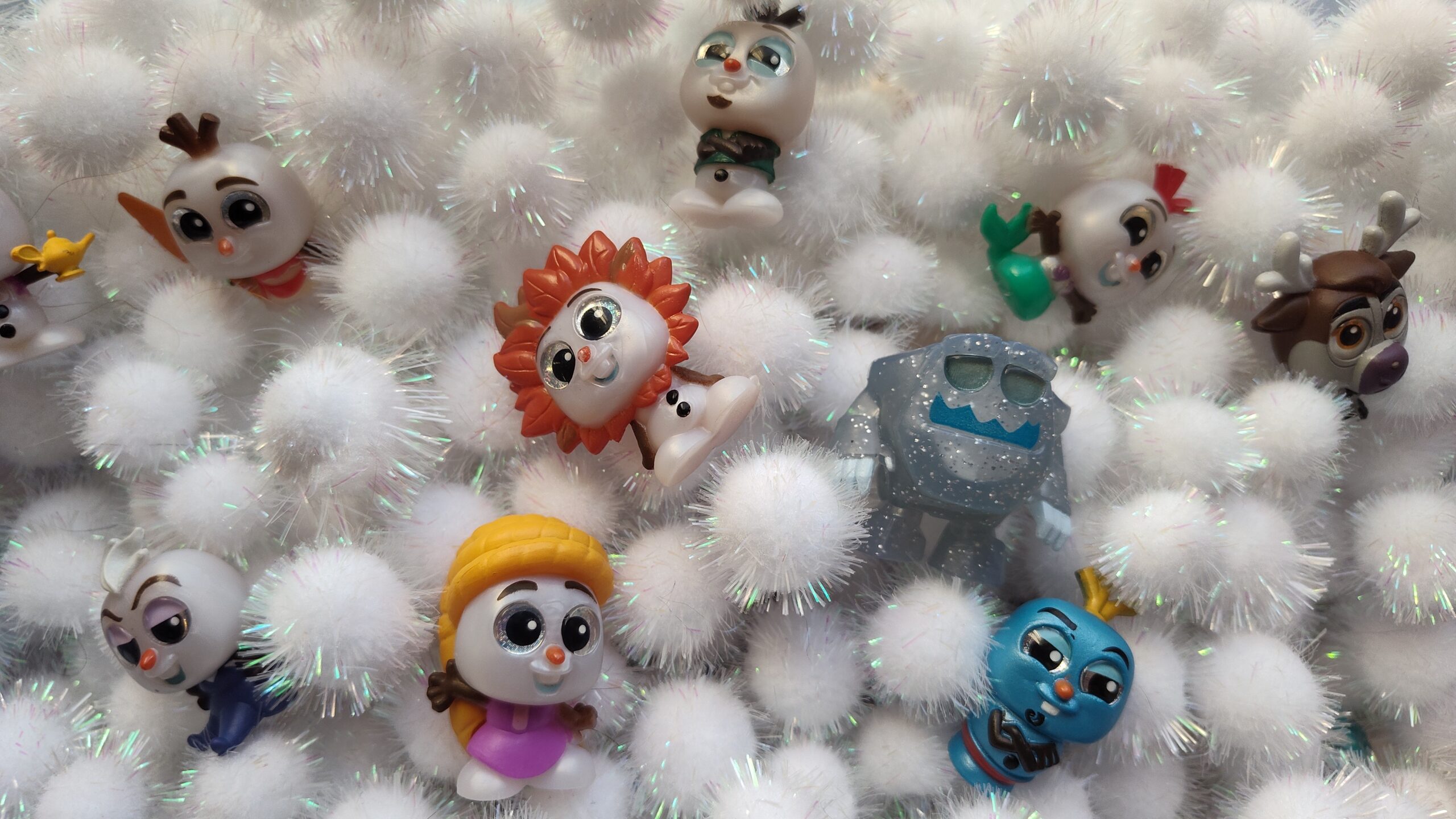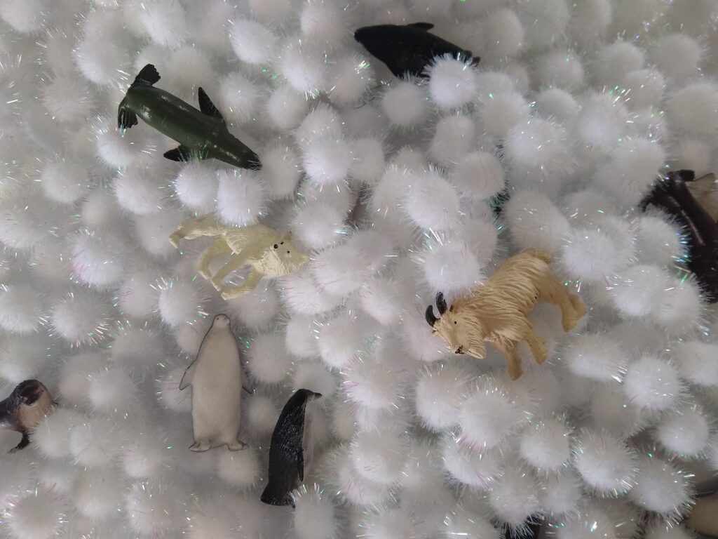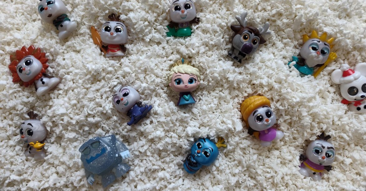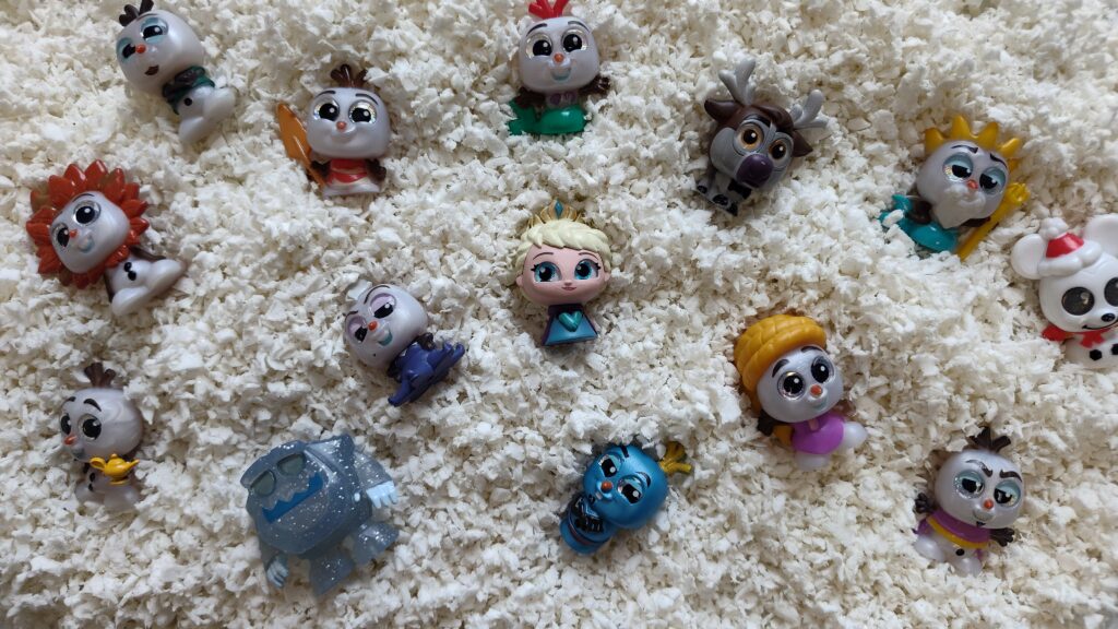 For my snow-themed sensory bin I usually use white tinsel pom-poms , but since white Pluffle came with the black Pluffle I got for my April sensory bin I decided to try that this year. I added the same Olaf Doorables that I got for my themed monthly prizes as well as an Elsa Doorable that I bought off eBay.