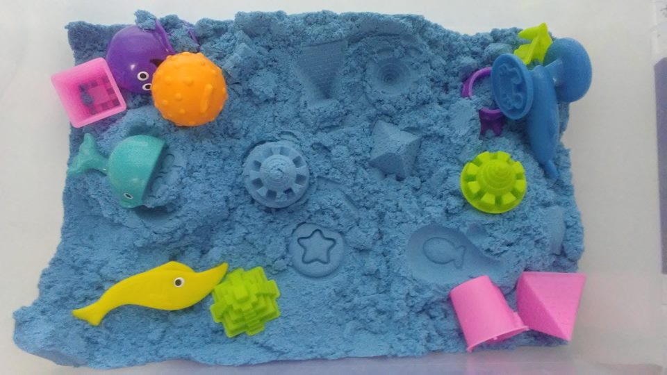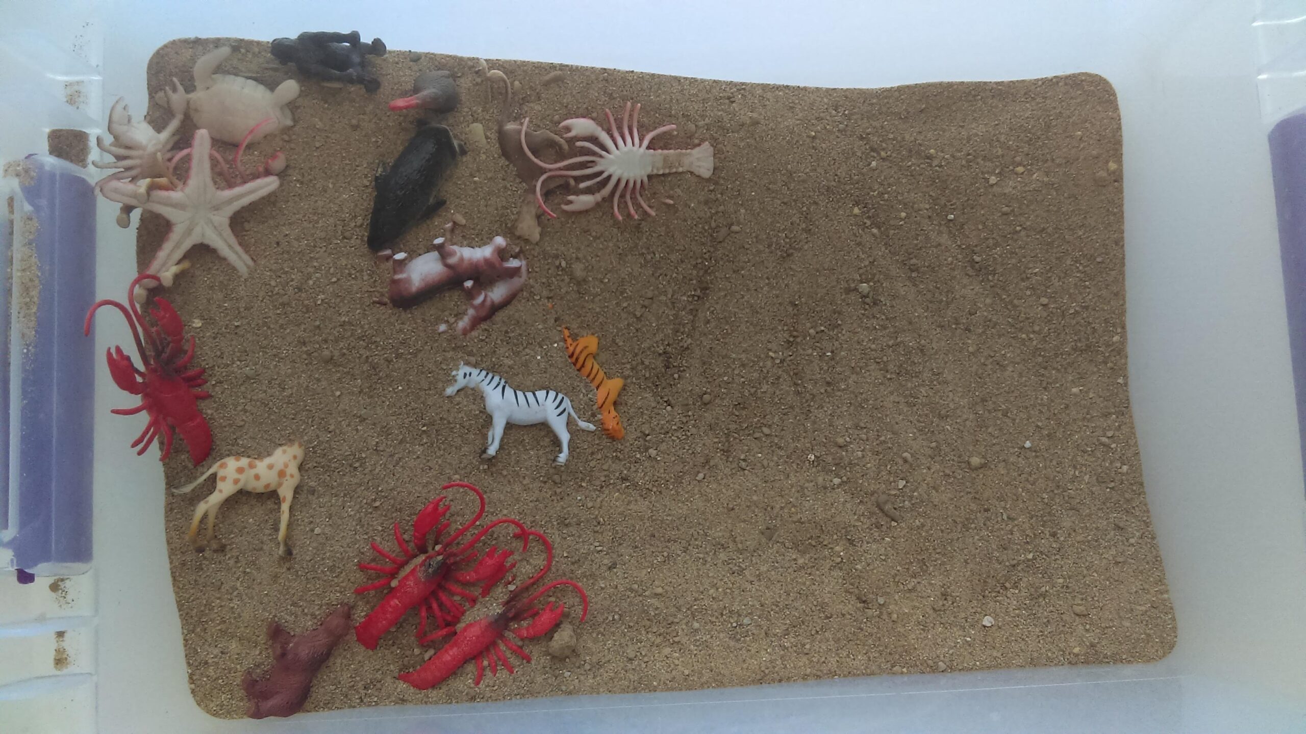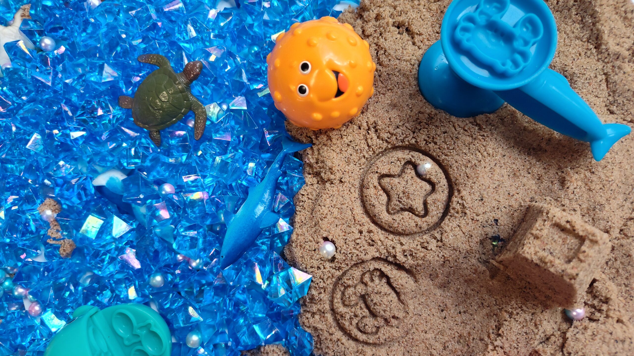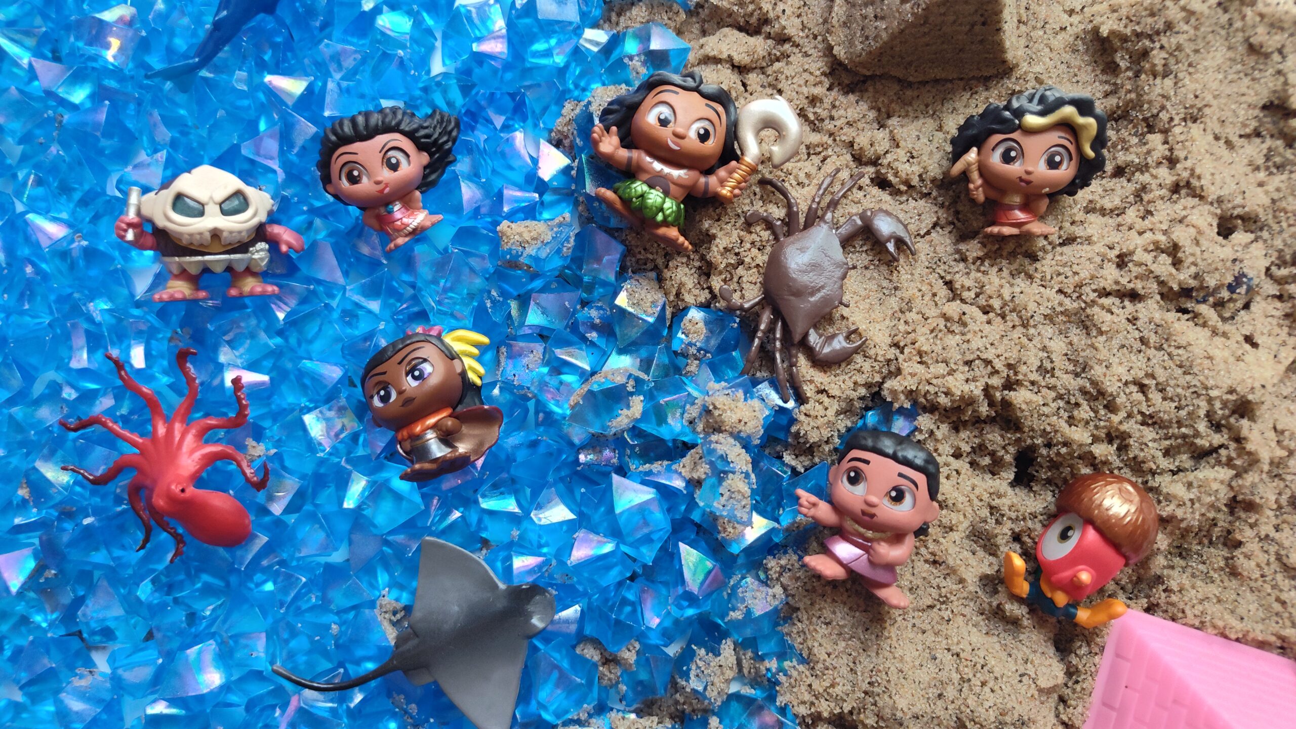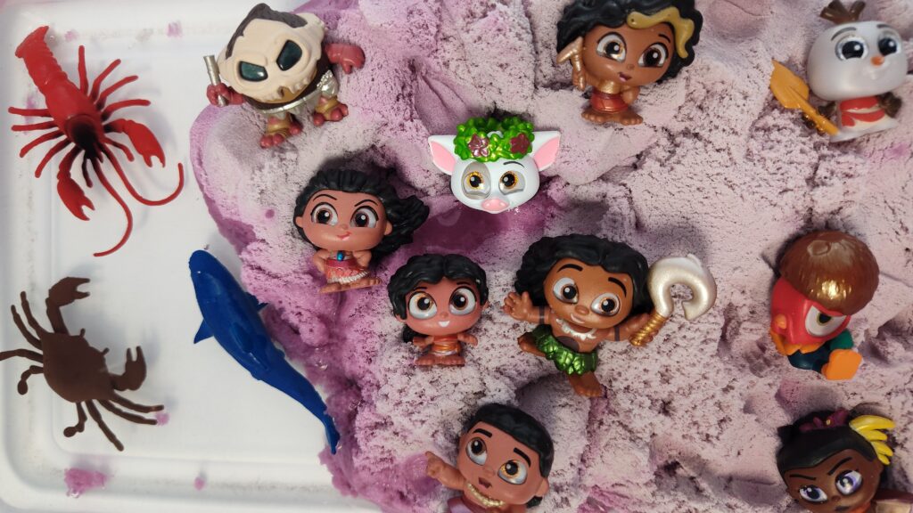 I added parts from my previous bins: these iridescent blue plastic pebbles, animal minis from the Terra Sea Life set, some sand castle-themed kinetic sand tools I got years ago (very similar to the ones in this set), and my Moana 2 Doorables.